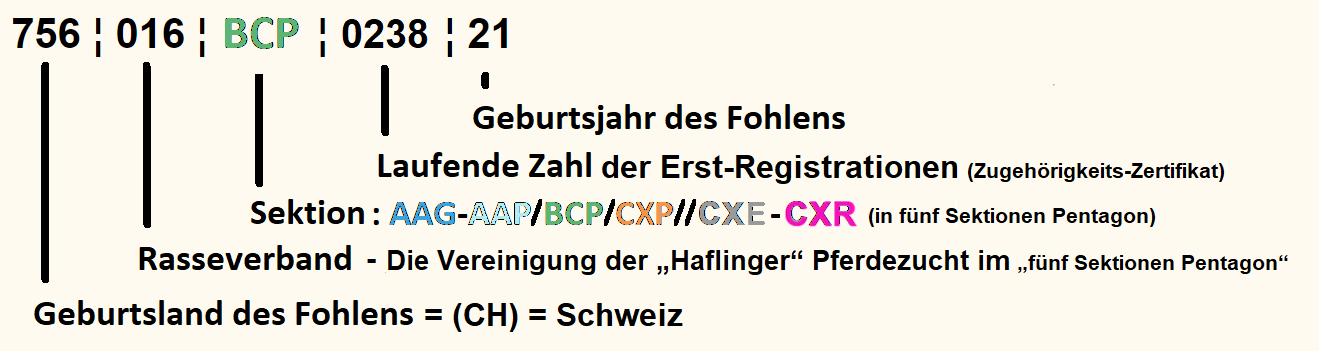 Der Fohlen-Equidenpass, ausgestellt von der CH-Login-Identitas AG, mit der TVD-N° 756-018 wird ergänzt mit der für die Haflingerpferderasse gültigen UELN (756 016 XXX XXXX XX), in der die Herkunfts-Zugehörigkeit-Kennzeichnungsbuchstaben der Sektionen, AAG-AAP // BCP, CXP und CXR = Register + CXR - in der alphanumerischen UELN (Universal Equine Life Number) enthalten sind.