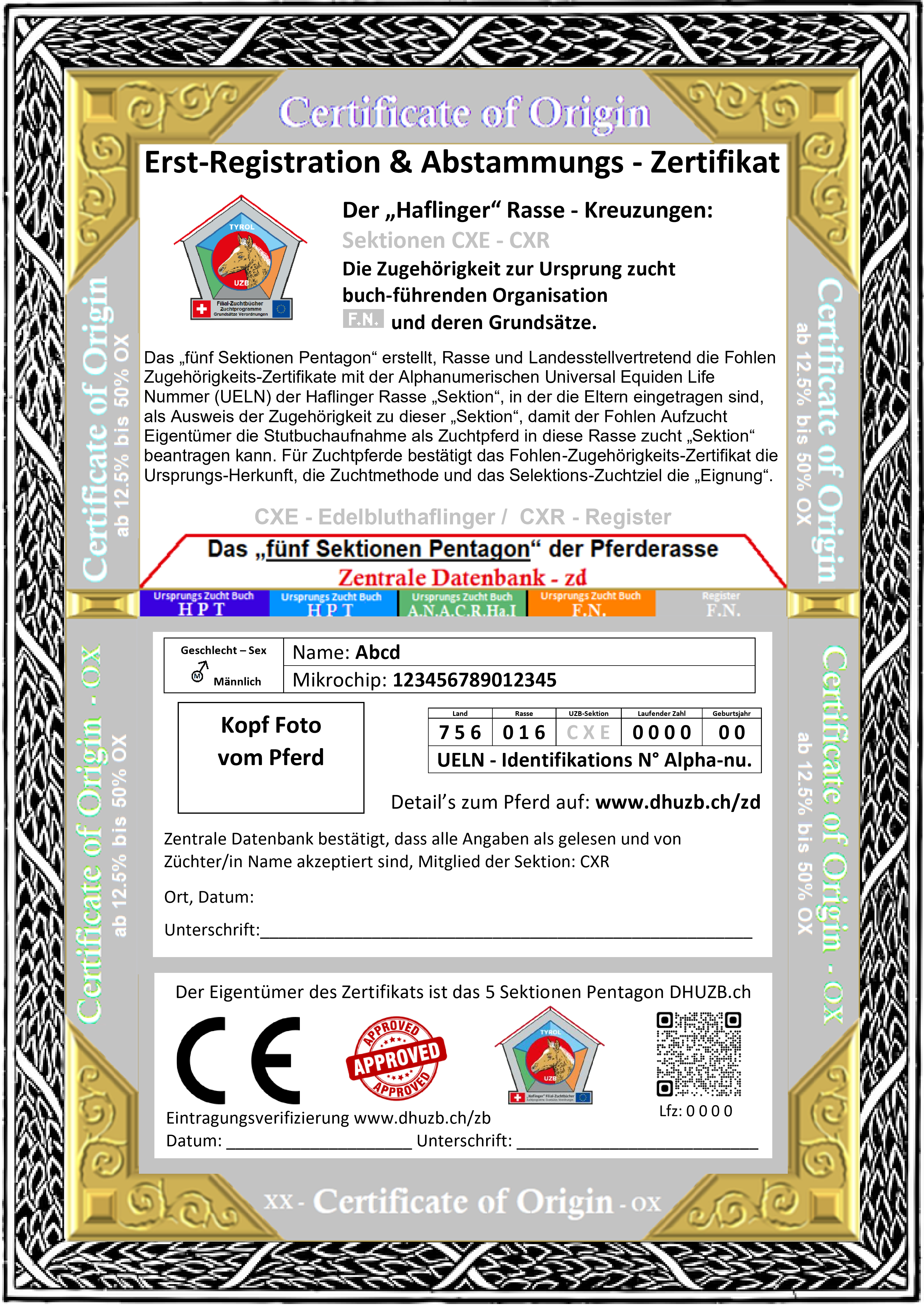-Brexita-CH 1697, 19 - ist die Laufendezahl der UELN, die Bestätigung zur Eintragung in der Zentrale Datenbank www.dhuzb.ch/zd. Die Erst-Registrations - Fohlen erhalten denn Zugerhörigkeit - Ausweis der Sektion AAG -