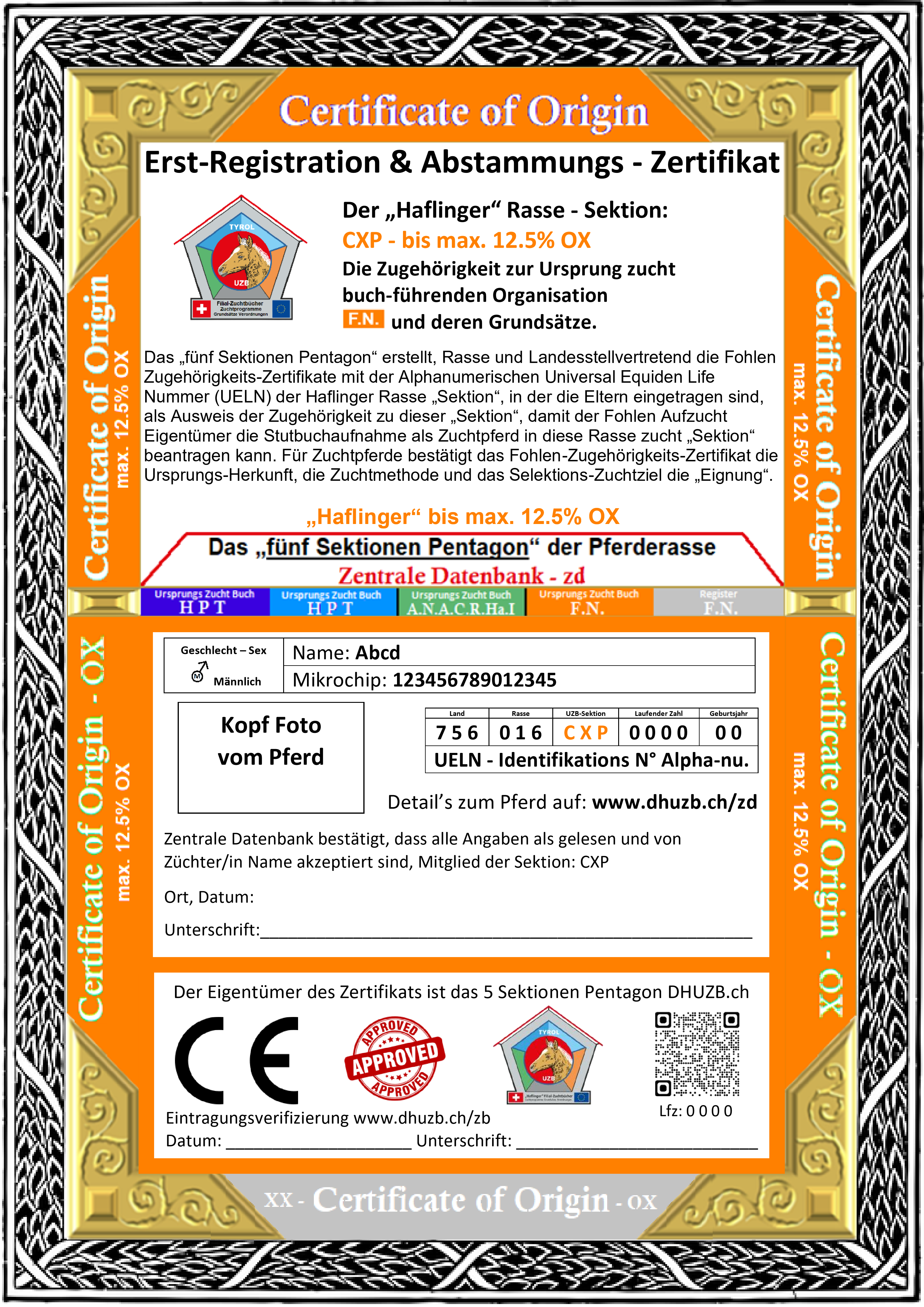 bis und mit 12.5% OX-Fremdblutanteil als zur Rasse „Haflinger“.gehörend!